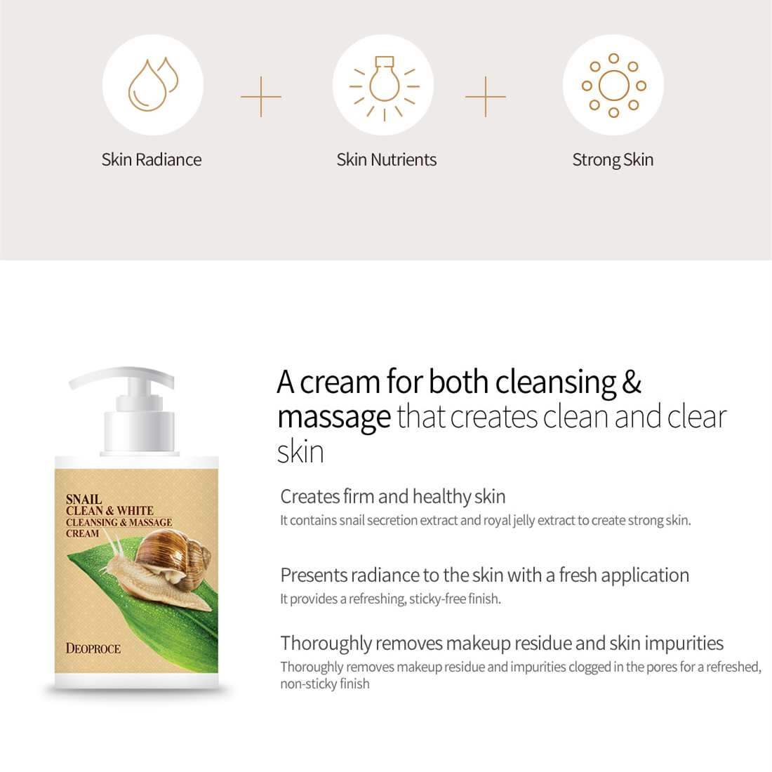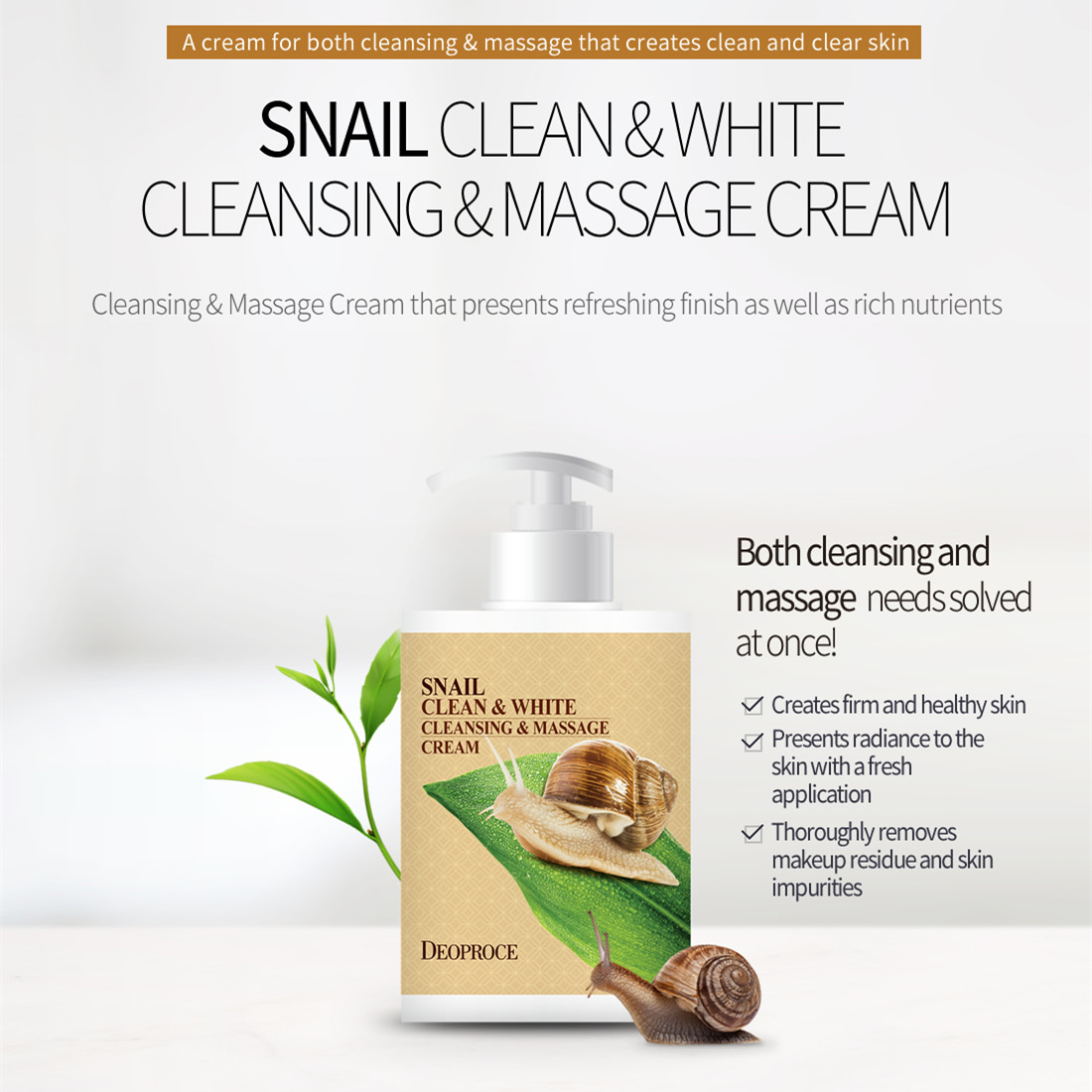 Deoproce Snail Cleansing & Massage Cream that presents refreshing finish as well as rich nutrients. It contains snail secretion and royal jelly extract to create stronger skin.