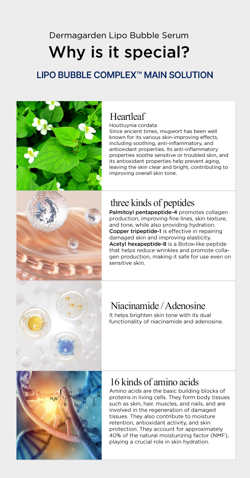 A next-generation oxygenating serum designed to deeply purify and energize tired, congested skin. Dermagarden Lipo Bubble Serum transforms into micro-bubbles upon application, helping to lift impurities from pores while delivering active ingredients more effectively.