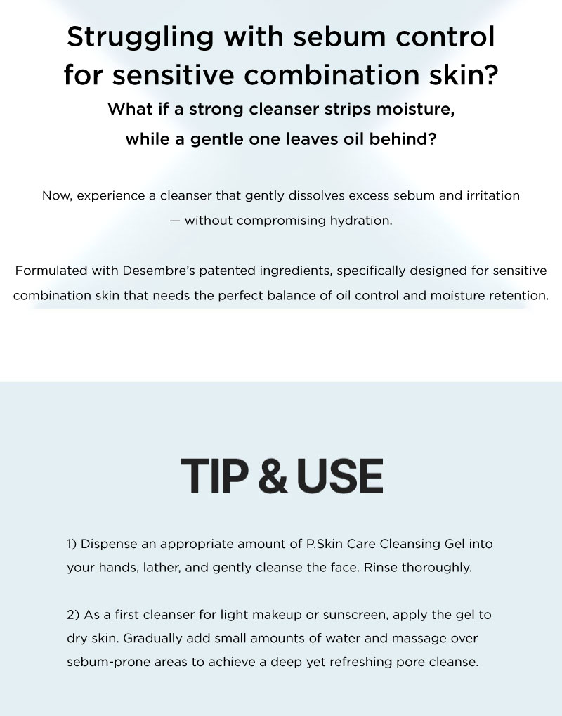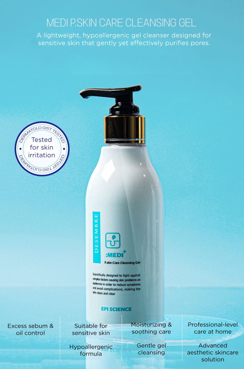 Dessembre P.Skin Care Cleansing Gel is a lightweight, hypoallergenic gel cleanser specially formulated for sensitive and combination skin. It effectively removes excess sebum, impurities, and pore waste while maintaining the skin’s natural moisture balance.