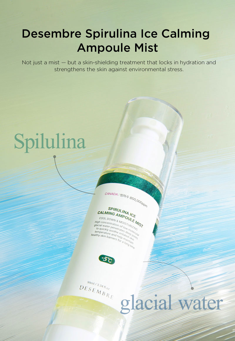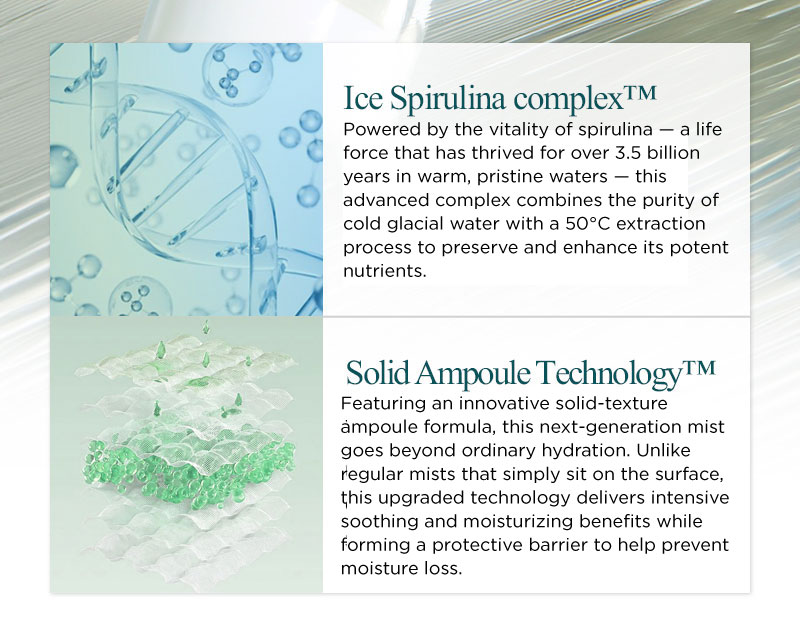 A refreshing dual-function ampoule mist infused with spirulina extract to instantly cool, calm, and hydrate stressed skin. This ultra-fine spray delivers concentrated nutrients while helping to reduce redness and irritation caused by heat, sun exposure, or sensitivity.