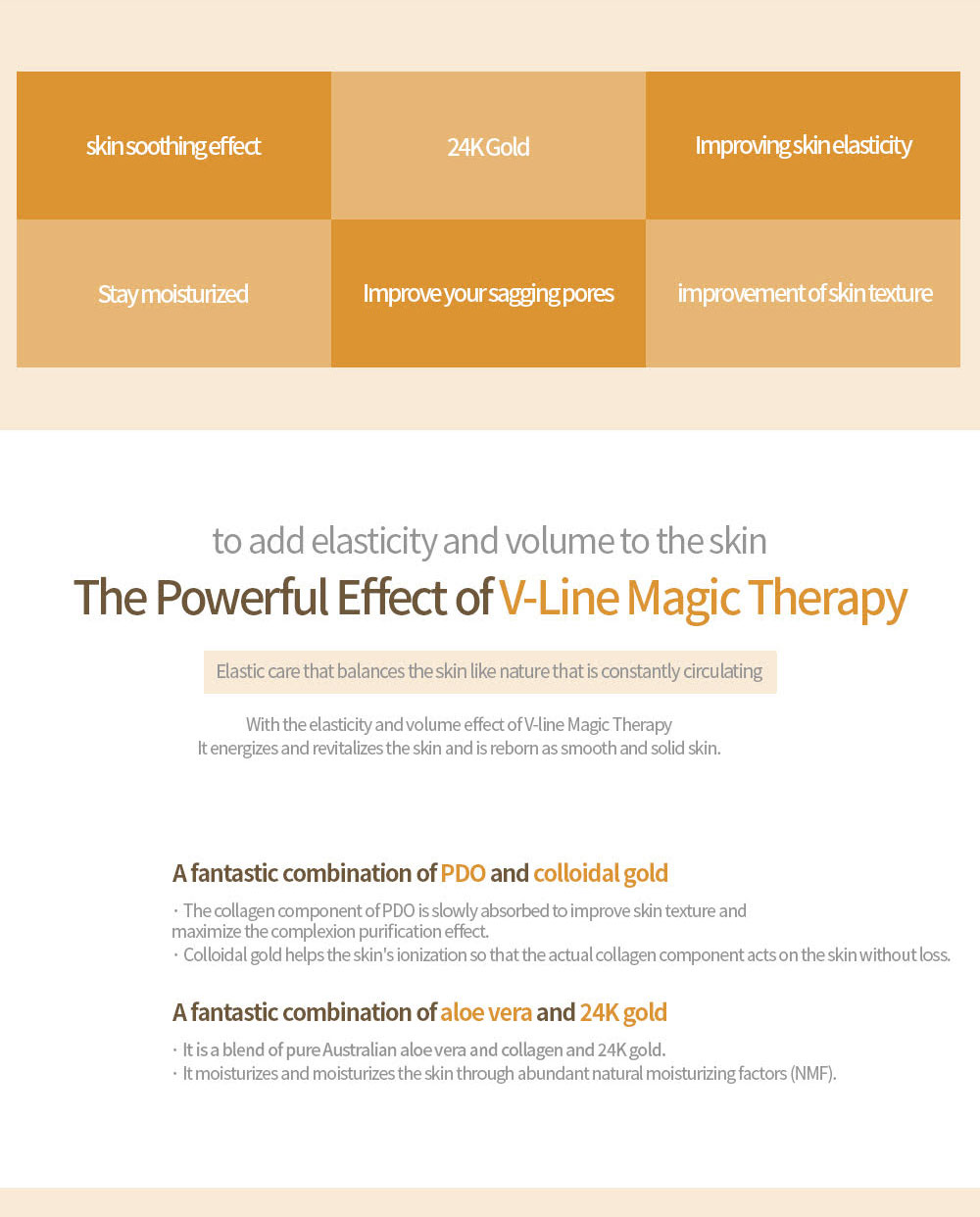 - Gold Lifting Gel (5ml x 14ea): Contains Colloidal Gold and collagen components that help lift and firm the skin while boosting elasticity.