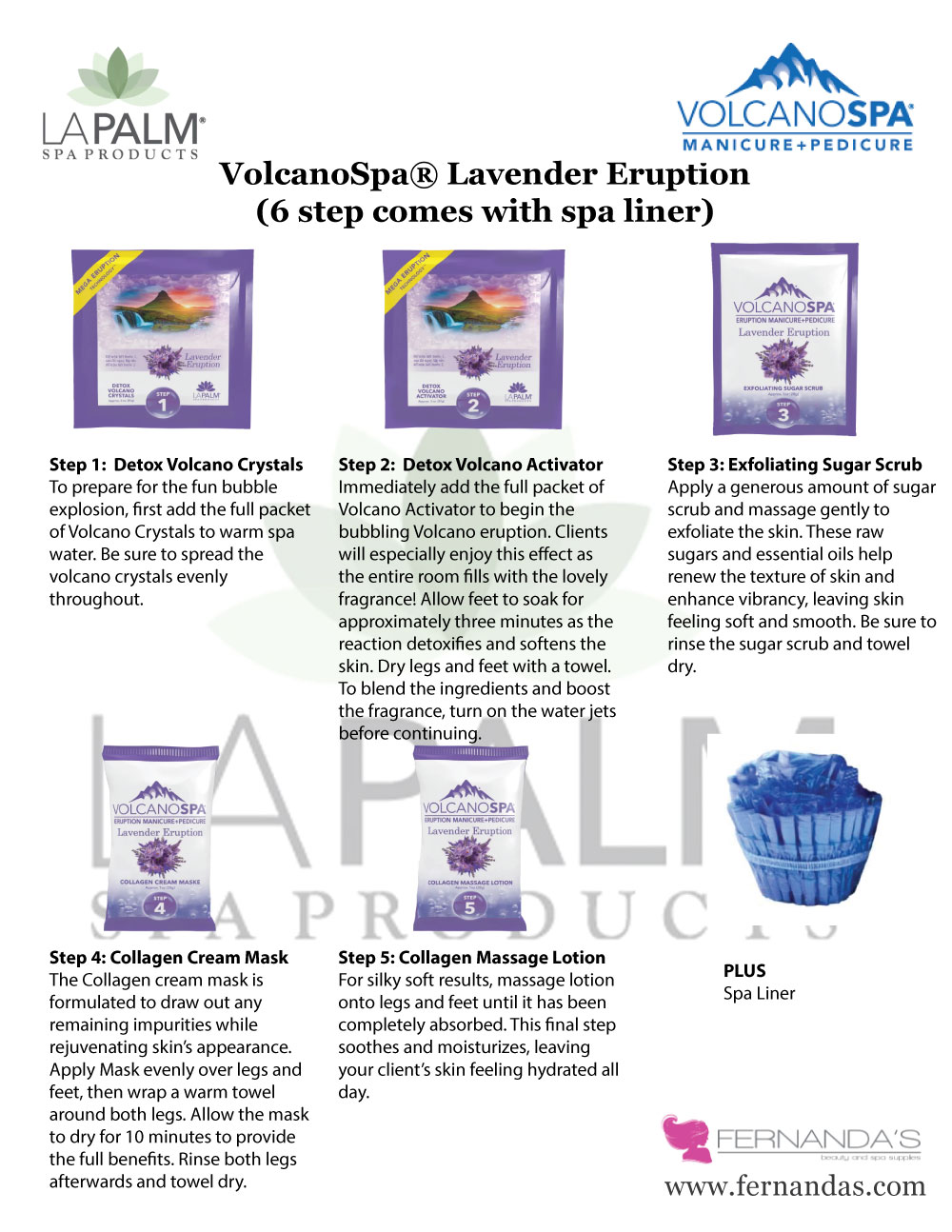Immediately add the full packet of Volcano Activator to begin the bubbling Volcano eruption. Clients will especially enjoy this effect as the entire room fills with the lovely fragrance! Allow feet to soak for approximately three minutes as the reaction detoxifies and softens the skin. Dry legs and feet with a towel. To blend the ingredients and boost the fragrance, turn on the water jets before continuing.